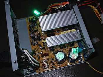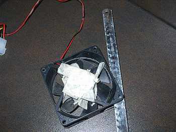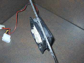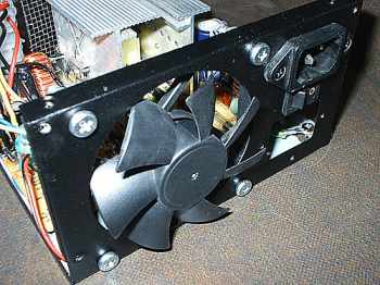 Теперь зелёный провод, который мы оставили, подпаиваем к пучку черных (ground). После этого, БП можно включать без материнки. НЕ ВКЛЮЧАТЬ БЕЗ НАГРУЗКИ!!! Нужно, что-то подсоединить к молексу, например, несколько кулеров, неоновую лампу… и т.д. Да, два синих провода на фото это от второго светодиода. Ставим вентилятор и крепим болтами, такими же что и планку к корпусу, чтоб соблюдать интерьер.