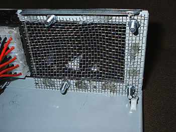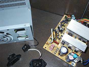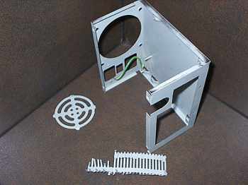 Пришла очередь корпуса. Выпаиваем штекеры питания. Их два, один можно сразу выкинуть в ящик стола, на его место мы поставим сетку. Спиливаем решетку для вентилятора (чтоб остался только круг), и решетку вентиляции (проделываем все с помощью того же надфиля): вот так это выглядит…