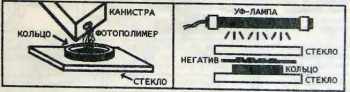 Жидкие фотополимеры имеют вид густообразной прозрачной массы, похожей на мед. Для получения штампа из него, потребуется 2 стекла и одно кольцо /рамка/ нужного размера, а также ультрафиолетовая; кварцевая или галогенная лампа. На стекло кладется рамка и в эту рамку заливается до краев сам фотополимер, затем сверху надо положить негатив на рамку и накрыть все это вторым стеклом.