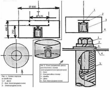 Возможно применение любого другого с сохранением числа оборотов вращения вала около 1500-2000 оборотов. Диск изготовлен из листового алюминия, диаметр 170 - 180 мм (и толщина - 0,2 - 0,3 мм. Можно использовать жесть от консервной банки (из под сельди).Втулка изготовлена из легкого материала методом токарной обработки и служит для соединения вала электродвигателя с диском. В данной конструкции желательно применение фторопласта, текстолита и т.п. Корпус представляет собой пустотелый цилиндр диаметром 700 -800 мм и высотой 350 - 400 мм. Для изготовления “ваты” в домашних условиях используйте полосу пластика или линолеума, соединив вместе ее короткие стороны.