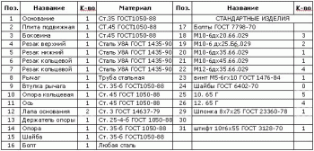 Приведенный режим термообработки - для стали У8А. При механической обработке резаков обратите внимание на точность режущих кромок, от них будет зависеть качество среза. Кроме резаков, оси, плиты подвижной и боковины, остальные детали можно изготовить из стали, имеющейся в наличии, на долговечность инструмента большого влияния это не окажет. Опора кольцевая может быть выполнена не только из чугуна, но и из любой конструкционной стали. Желательно изготовить сразу несколько опор. Ось поз.11 вытачивается на токарном станке из прутка 50 мм стали 45 (допускается: Ст.40, Ст.5, Ст.6). Для фиксации рычага HP, в оси со стороны крепления рычага, сверлят отверстие и нарезают резьбу под болт М10 поз.18. Основная фиксация рычага - при помощи шпоночного соединения, для чего в оси вырезана канавка под шпонку поз.29. После механической обработки ось подвергнуть термообработке: закалка - нагреть до 830-850 °С, охладить в воде; отпуск - нагреть до 390-410 °С, охладить в воде. Выдержка при температурах обработки 5 мин, режим приведен для стали 45. Плита подвижная поз.2 изготовлена из листа стали 45 (доп. замена на сталь 40. Ст.5, Ст.6). Резьбовые отверстия М5 - для нанесения на трущиеся поверхности масла. Боковина изготовлена из листа стали 45 (Ст.40, Ст.5, Ст.6). Резьбовое отверстие М6 - для смазки. Втулка рычага поз.9 из стали 35-б (доп. Ст.5. Ст.6), во втулке выполнена канавка под шпонку. Рычаг изготовлен из стальной водо-газопроводной одно-дюймовой трубы. Длина выбирается произвольная от 400 до 700 мм в зависимости от нужного усилия на рычаге. Основание - самая сложная деталь HP, выполнена из листа стали 35 (доп. Ст.5, Ст.6). Опора кольцевая состоит из двух половин выточенных из чугуна высокопрочного ВЧ 42-12, допускается замена на стали 40, 45, Ст.5, Ст.6.